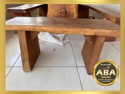 01 (Uma) mesa de madeira Angelim, 02 (Dois) bancos de 90 cm de madeira Angelim, 04 (Quatro) bancos de 2 metros de madeira Angelim.